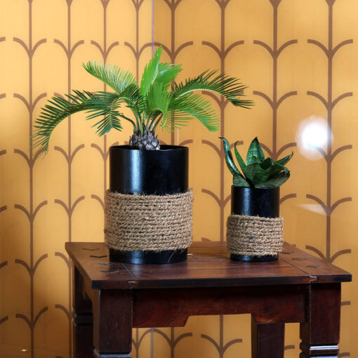 A Trendy metal with jute plant Pots / table top pot with smooth powder coated finish for rust resistance. A great piece of art for metal lovers. Purely conceptualised & made in India by local iron crafter/Blacksmiths. Suitable for plants indoor/outdoor/terrace/balcony gardens. Can be use for homes & office. Comes with a proper drainage holes. n