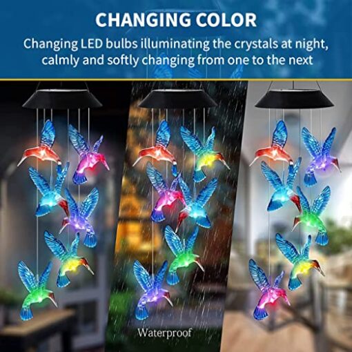 MULTI COLOUR CHANGING CHIME : Changing colors alternating randomly, these shine and colorful hummingbirds fly in the night. They will change various kinds of brilliant colors to light up your heart, pleasure you and your family.
